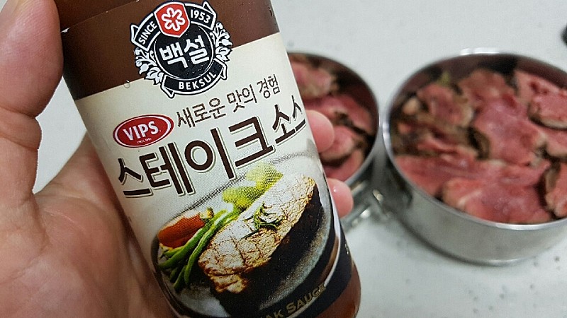 안심 스테이크 위로 스테이크 소스를 춱춱춱 뿌려줍니다.