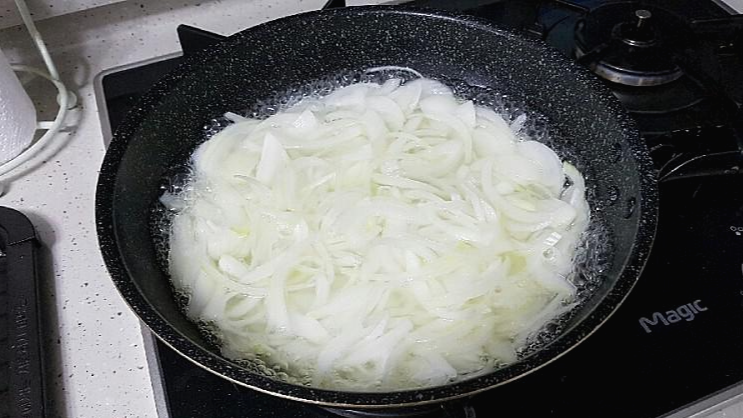 그리고 웍에서 끓는물에 채썬 양파를 넣고 살짝 끓여줍니다.