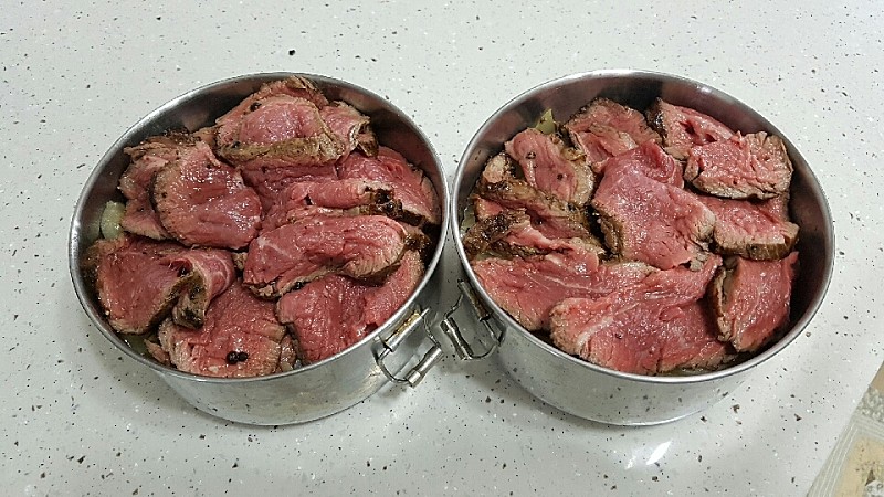 후라이팬에 골고루 구운 고기는 또 후숙을 시켜줍니다.