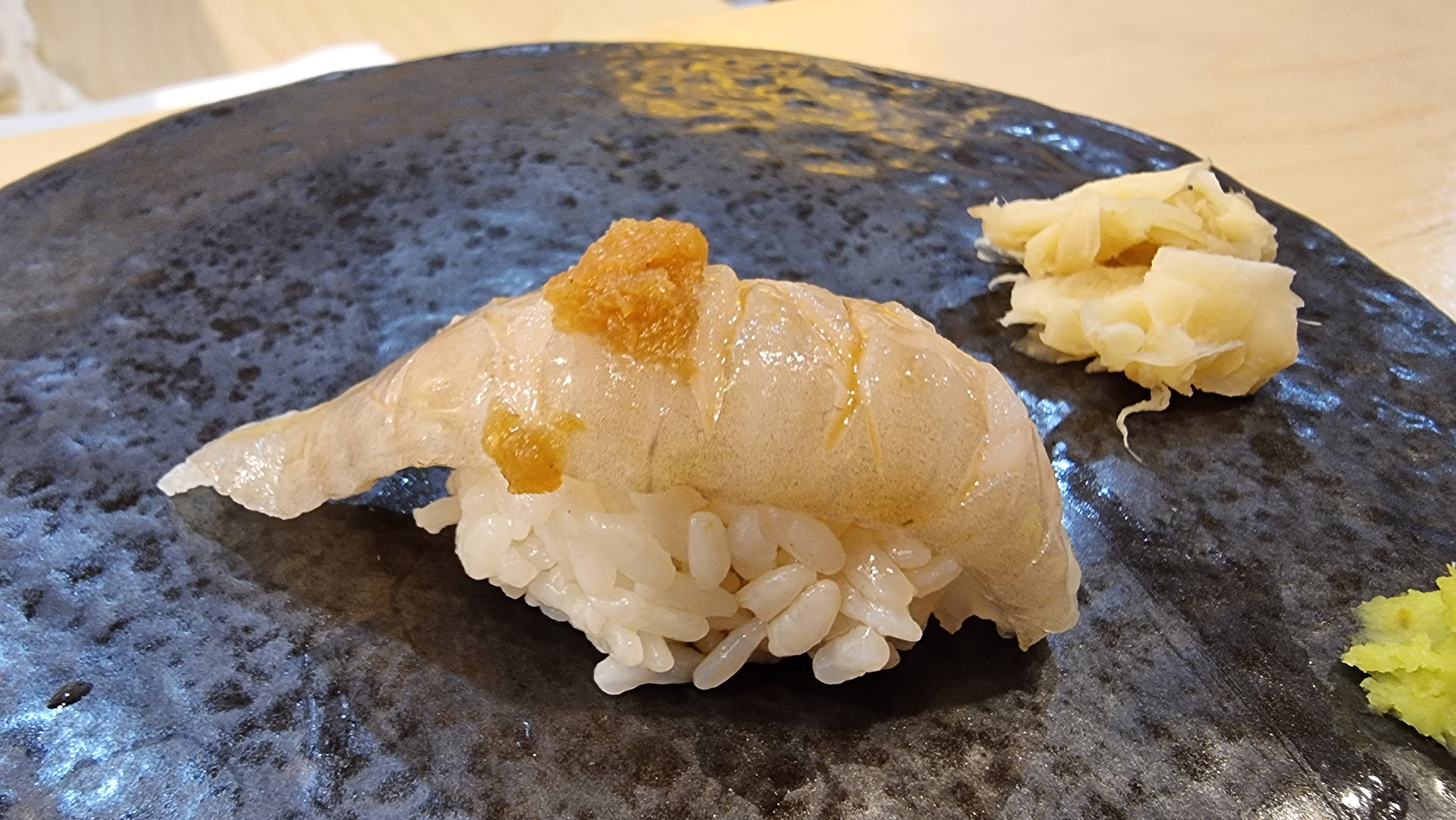 새우와 밥 사이에 살짝 들어간 명란젓이 적절하게 간이되어 큼직한 대하와 밥을 막힘없에 먹을수 있게 해주었던 초밥입니다.