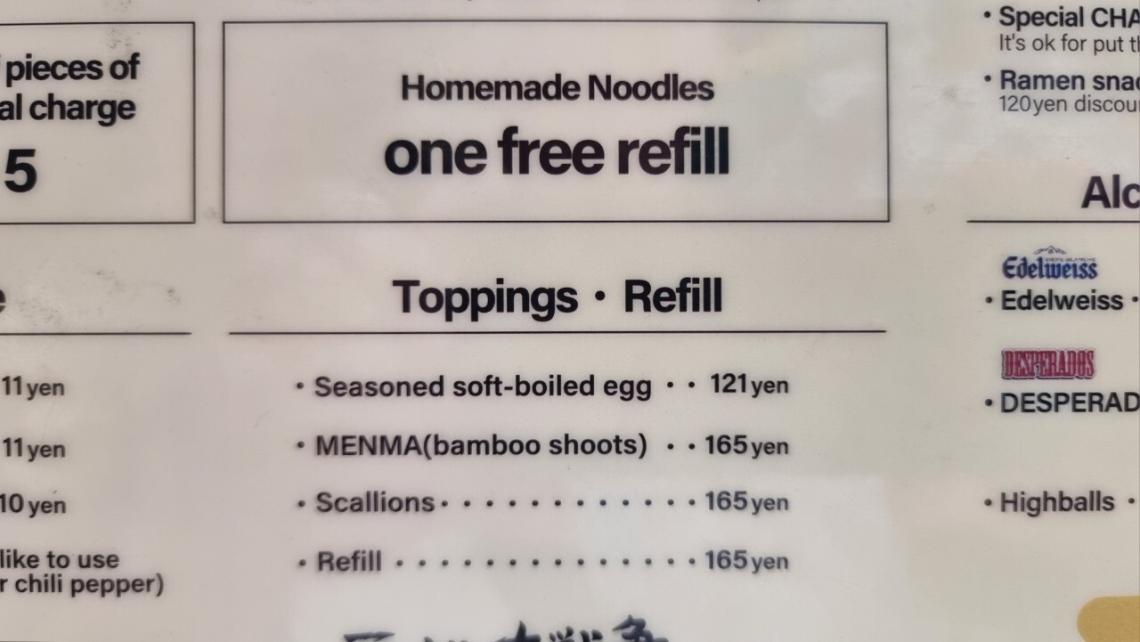 삶은 계란, 죽순 절임, 대파등 토핑을 추가로 주문 가능하며 리필 메뉴를 통해 처음과 같이 추가로 주문도 가능한가 봅니다.