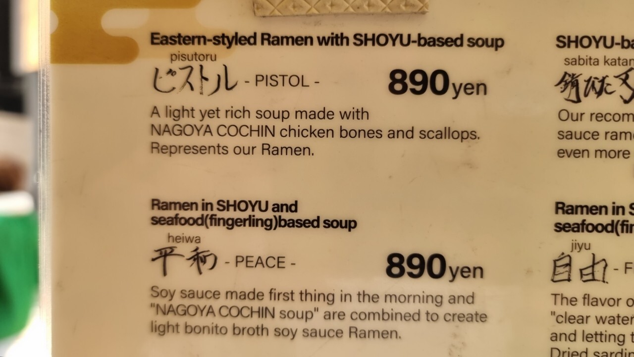 SHOYU 간장을 베이스로 하는 피스톨, 피스, 러스티 블레이드, 프리돔 이라는 영화나 만화에 나올법한 단어로 라멘 이름이 되어 있습니다.